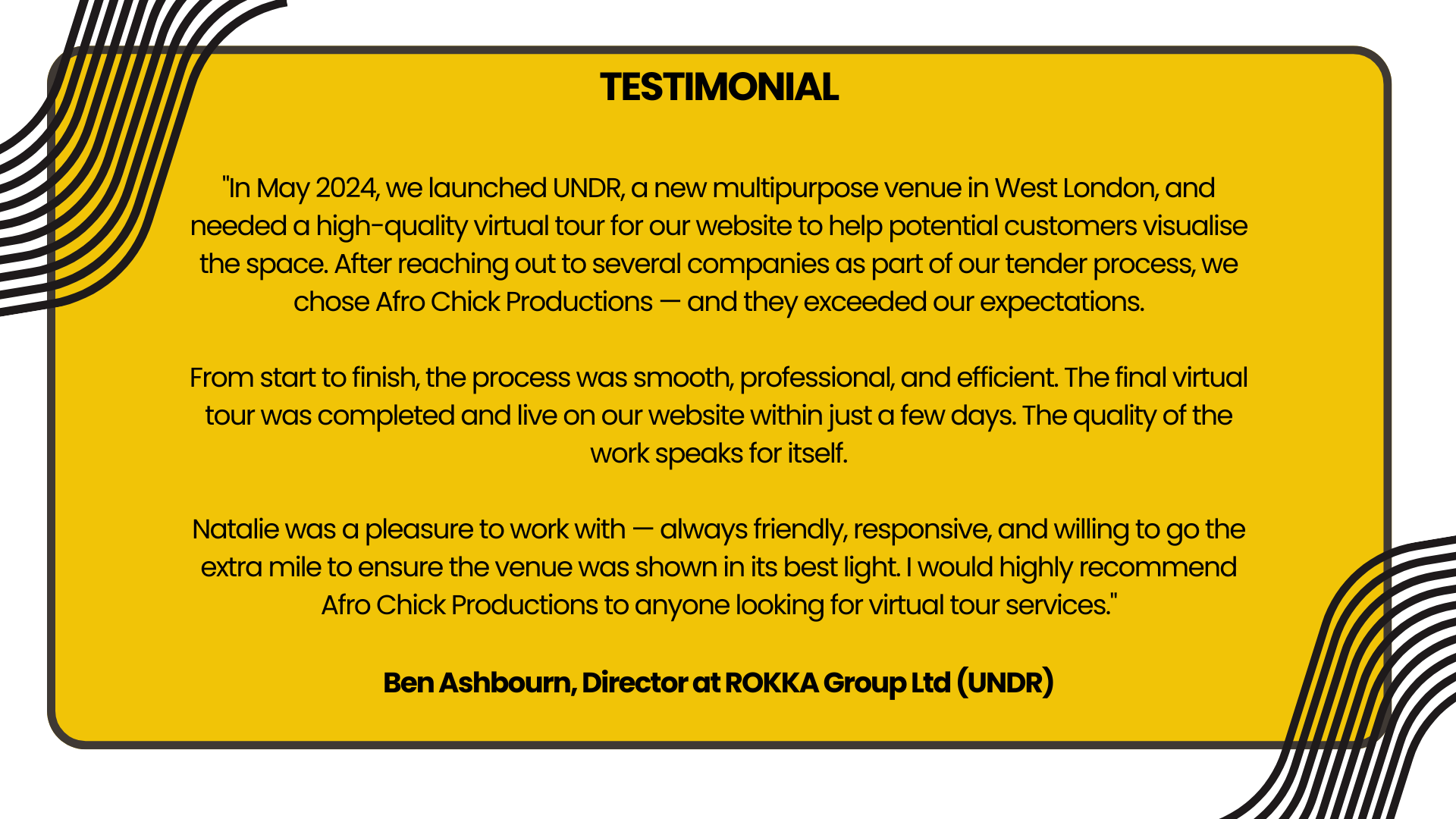 When UNDR, a dynamic multipurpose venue in the heart of Ladbroke Grove, launched in May 2024, they needed a high-quality virtual tour to help potential customers visualize their versatile cultural space. After a competitive tender process involving multiple companies, they chose Afrochick Productions – and the results exceeded all expectations.