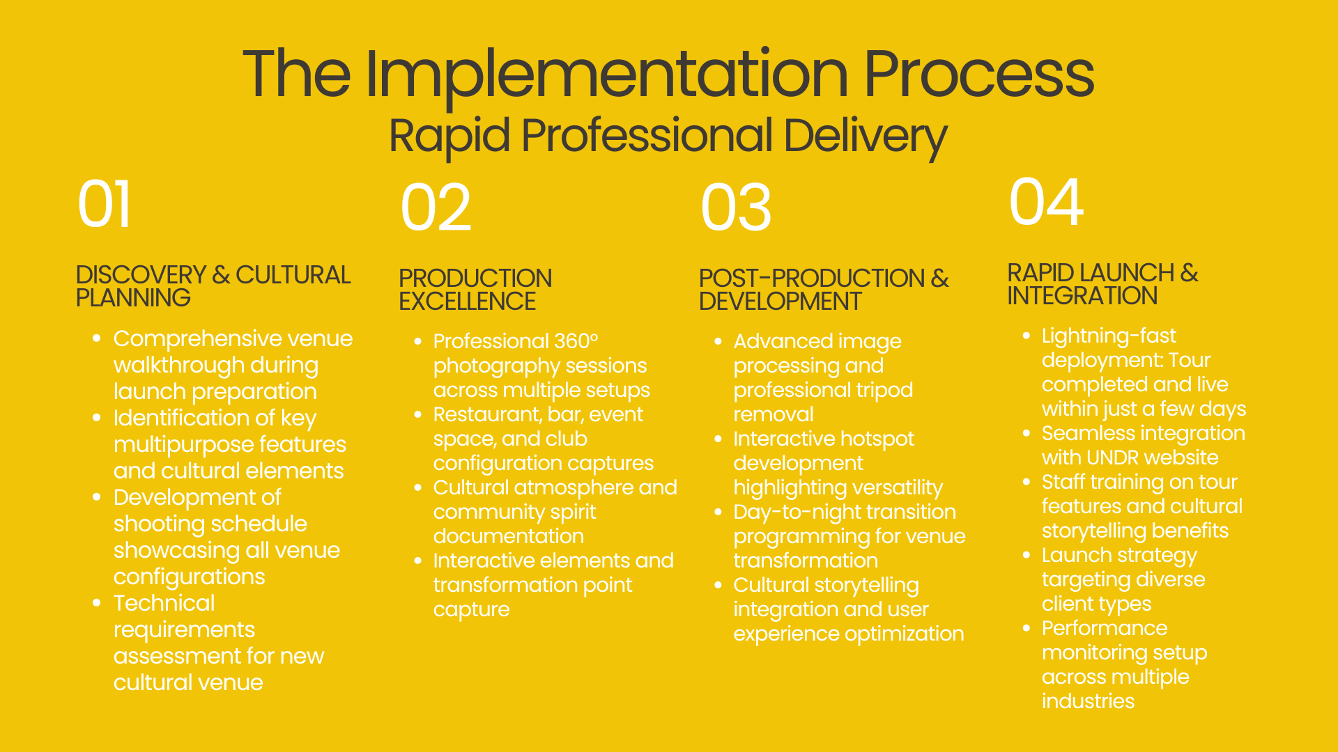 This project demonstrates the transformative power of 360° virtual tours for cultural venue launches in competitive markets. The success at UNDR has become a benchmark for how immersive technology can drive immediate business results while establishing authentic cultural presence and community connection.